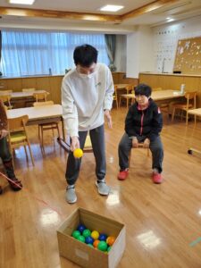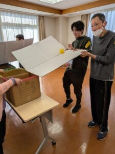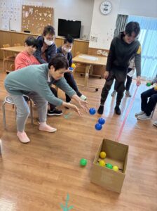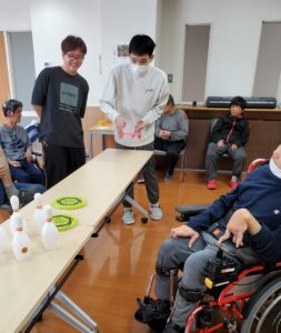 箱にタイミング良く玉が入ったり、入らなかったりとドキドキハラハラするゲームでした♪思わず身を乗り出して楽しむ利用者さんも多かったです!!