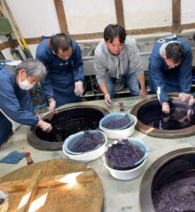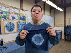 藍の館では、見本の柄から自分の好きな柄を決め、割りばしや輪ゴムを使いタオルに模様をつけ、染液に浸す藍染体験をしました👕