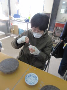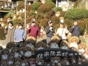 体験では、たぬきに囲まれた場所で上絵付体験を行いました!